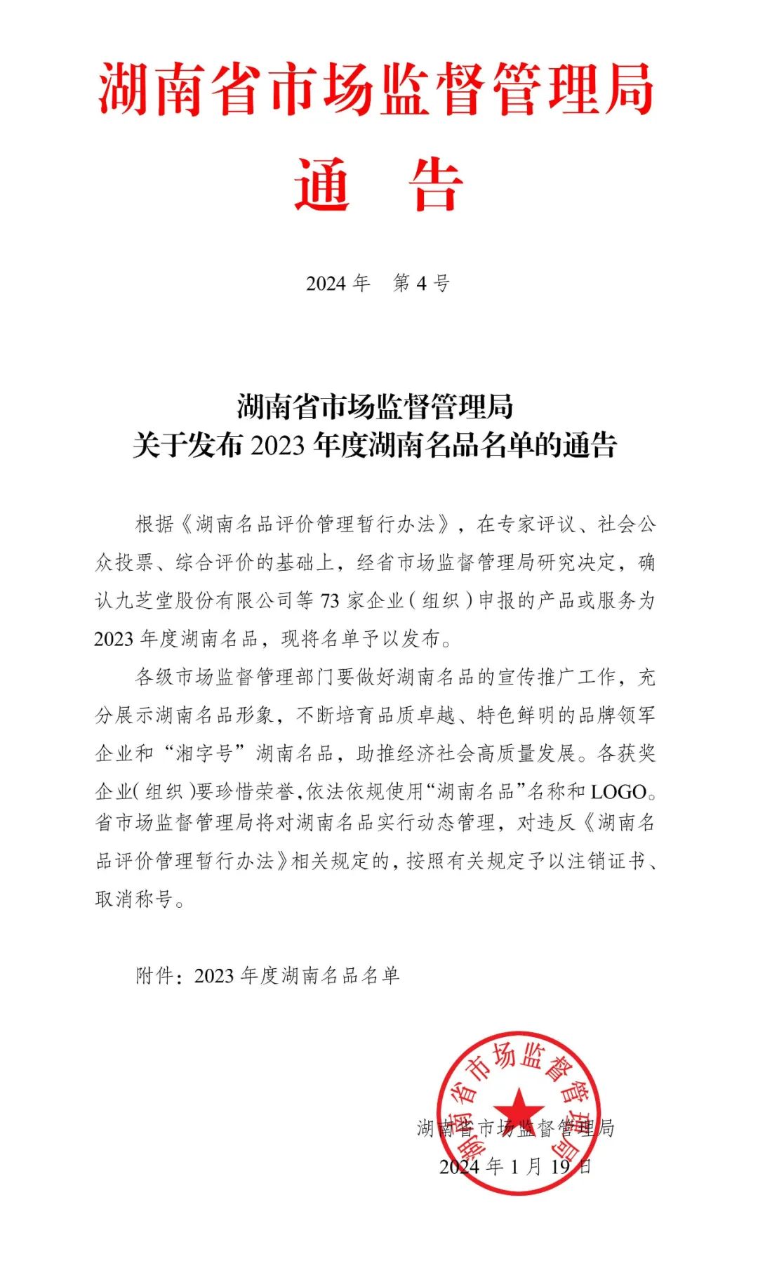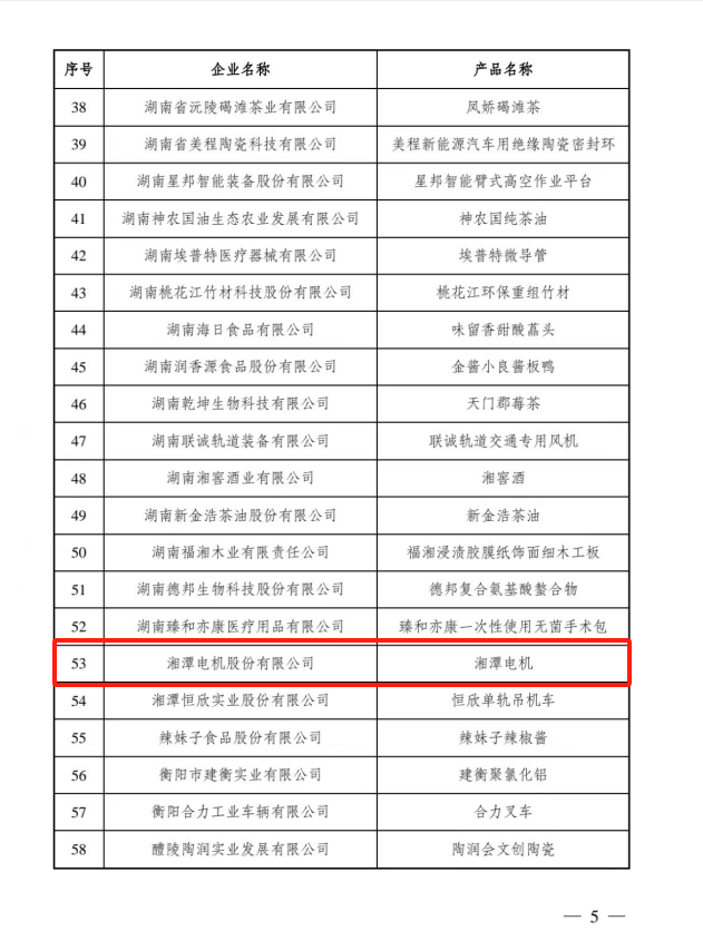 2024年1月19日,湖南省市场监督管理局发布2023年度湖南名品名单,湘潭电机获评首届“湖南名品”荣誉称号。2023年,为了突出优势特色农产品、先进制造业、现代服务业和区域公共产品与服务等重点领域,评选认定出一批质量过硬、技术领先、社会认可、业绩突出、放心安全的“湖南名品”,湖南省市场监管局首次开展“湖南名品”培育与评价工作。经过专业评价、社会评价、综合评价三个阶段的层层筛选,湘电集团成功斩获此项殊荣。