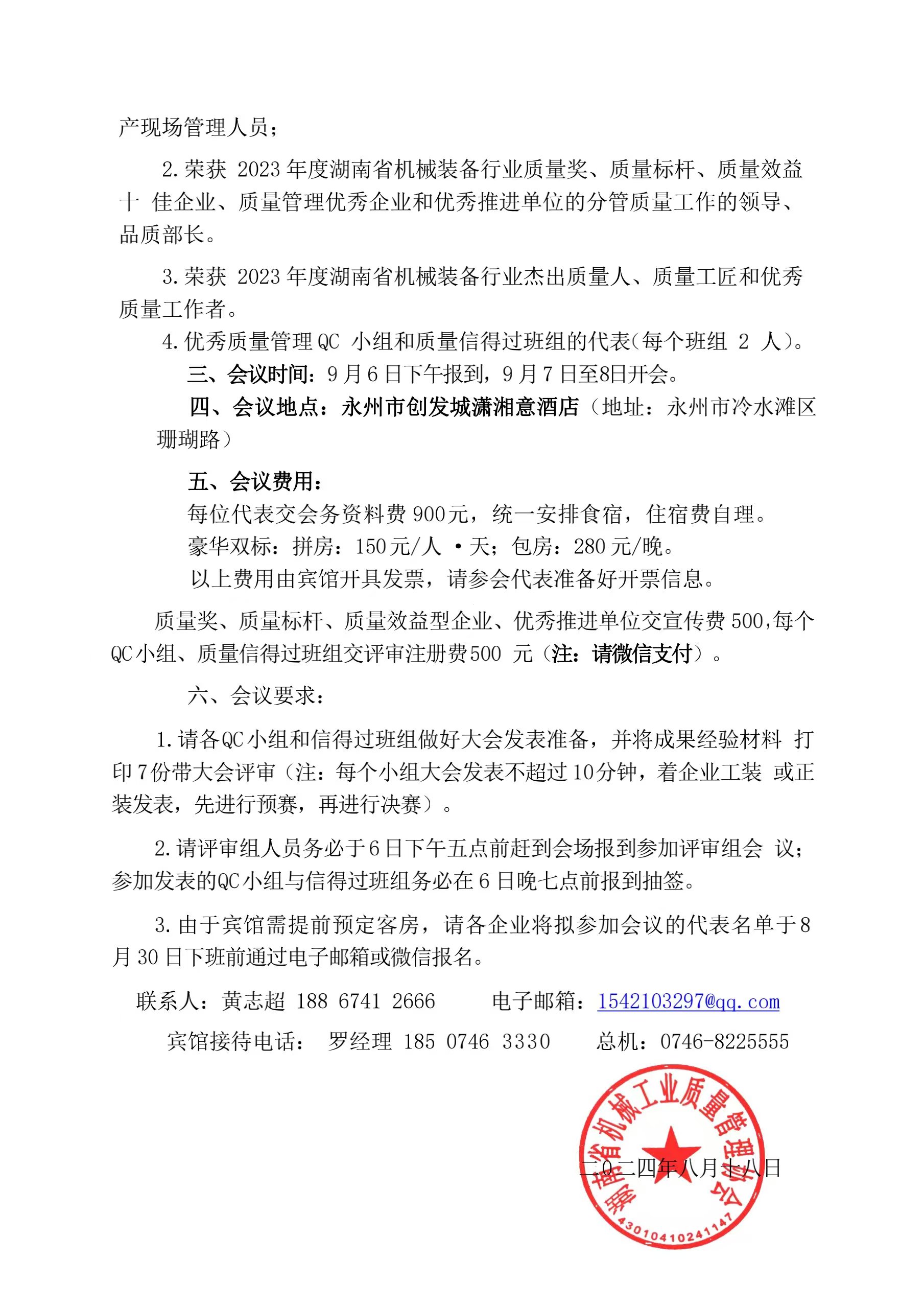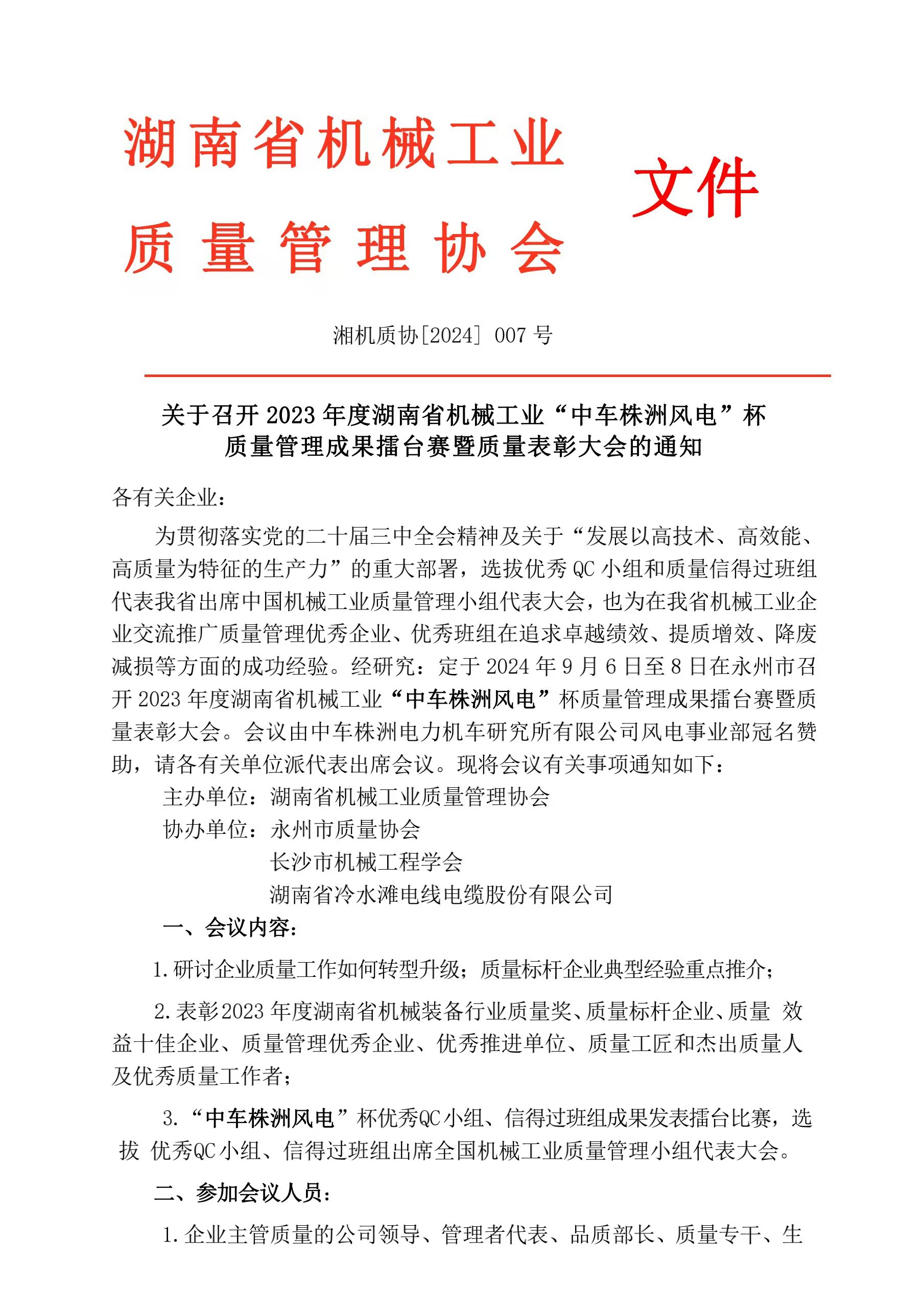 为贯彻落实党的二十届三中全会精神及关于“发展以高技术、高效能、高质量为特征的生产力”的重大部署,选拔优秀QC小组和质量信得过班组代表我省出席中国机械工业质量管理小组代表大会,也为在我省机械工业企业交流推广质量管理优秀企业、优秀班组在追求卓越绩效、提质增效、降废减损等方面的成功经验。经研究:定于2024年9月6日至8日在永州市召开2023年度湖南省机械工业“中车株洲风电 ”杯质量管理成果擂台赛暨质量表彰大会。会议由中车株洲电力机车研究所有限公司风电事业部冠名赞助,请各有关单位派代表出席会议。