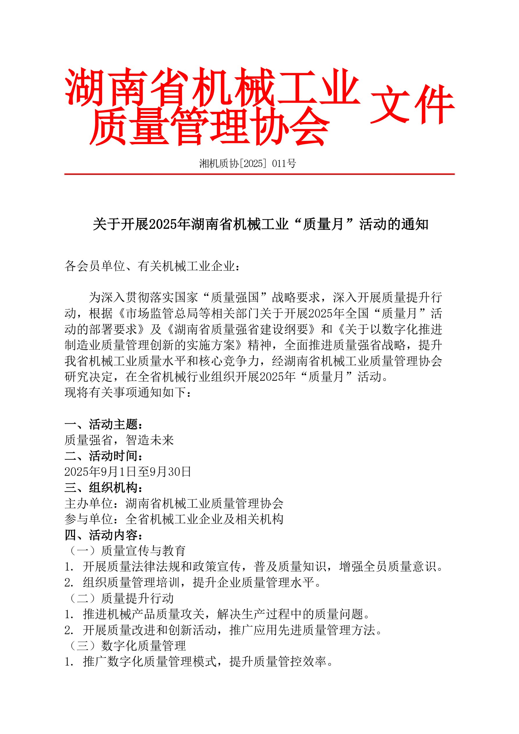 关于开展2025年湖南省机械工业“质量月”活动的通知