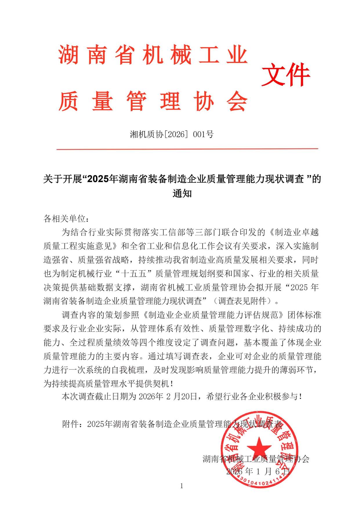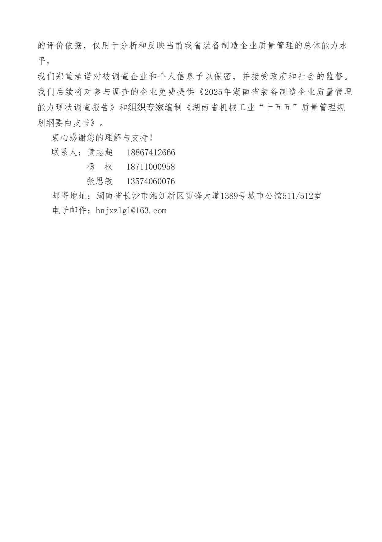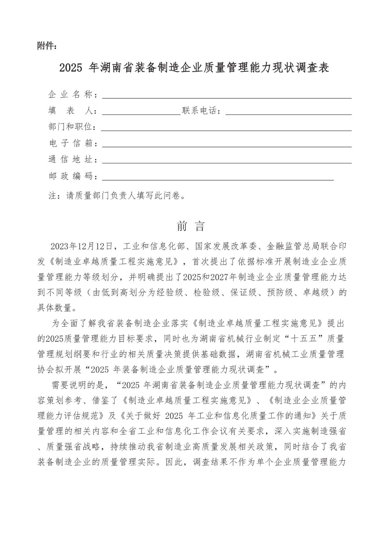 关于开展“2025年湖南省装备制造企业质量管理能力现状调查 ”的通知附件下载:关于开展“2025年湖南省装备制造企业质量管理能力现状调查 ”的通知.pdf